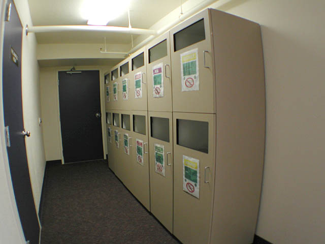 This shows how much they're into recycling. Everyone of these bins is for a different item, such as aluminum cans, light metals, heavy metals, burnables, food waste, construction debry, plastics, dorm products, and glass to name a few. Everything must be sorted. You will all learn about this when you arrive. You are required to take a waste management course when you get here.