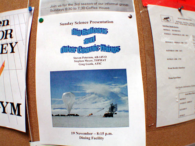 Picture of a poster hanging in the galley. If you can't read it, it's for the science lecture this Sunday night at 8:15, given by Steve Peterzen, Greg Guzik, and Steven Meyer.