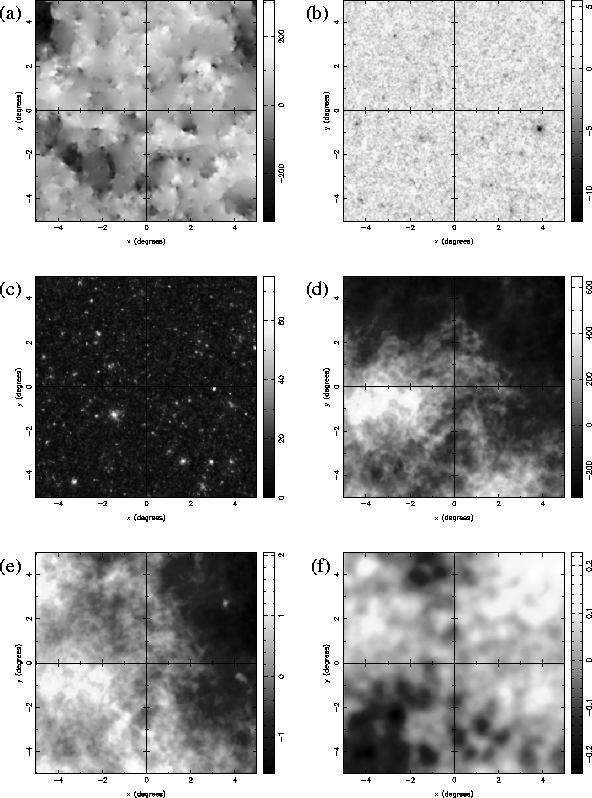 The realisations of the six input components used to make simulated observations are shown in Fig. 1. Each component is plotted at 300 GHz and, for illustration purposes, has been convolved with a Gaussian beam of FWHM equal to 4.5 arcmin, which is the highest angular resolution proposed for the Planck Surveyor. For convenience, we have also set the mean of each map to zero, in order to highlight the relative level of fluctuations due to each component.