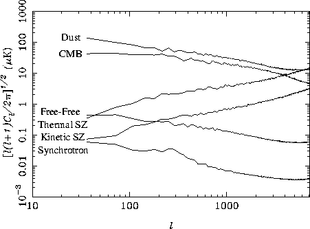 SZ effect; (d) Galactic dust; (e) Galactic free--free; (d) Galactic synchrotron