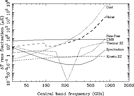Fig. 3 shows the rms temperature fluctuations as a function of observing frequency due to each physical component, after convolution with the appropriate beam. The rms noise per pixel at each frequency channel is also plotted. We see from the figure that, as expected, the rms temperature fluctuation of the CMBR is almost constant across the frequency channels, the only variation being due to the convolution with beams of different sizes. Furthermore, for all channels up to 217 GHz, the CMBR signal is several times the level of the instrumental noise. At higher frequencies, the noise level exceeds the CMBR signal but is itself dominated by Galactic dust emission. We also see a sharp dip in the rms level of the thermal SZ effect at 217 GHz, since the emission from this component is close to zero at this frequency. At any given frequency, the rms level of the thermal SZ effect is at least an order of magnitude below that of the dominant component. The kinetic SZ effect has the same spectral characteristics as the CMBR, but the effect of convolution with beams of different sizes has a significant effect on the point-like emission and leads to a more pronounced variation in the observed rms level than for the CMBR. The observed rms level of the kinetic SZ is at least two orders of magnitude below the dominant component at any given frequency. In a similar manner, the Galactic free--free and synchrotron emission are also completely dominated by either CMBR or dust emission at all observing frequencies.