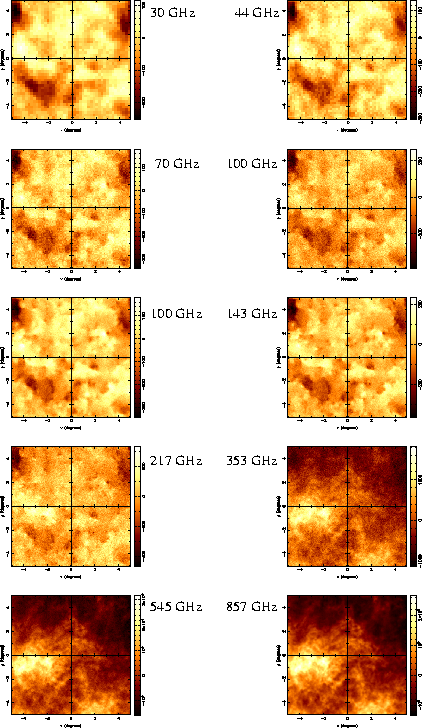 The coarse pixelisation at the lower observing frequencies is due to the FWHM/2.4 sampling rate. Moreover, at these lower frequencies, the effect of convolution with the relatively large beam is also easily seen. As the observing frequency increases, the beam size becomes smaller, leading to a corresponding increase in the sampling rate. Consequently, the observed maps more closely resemble the input map of the dominant physical component at each frequency. As may have been anticipated from Fig. 3, the emission in the lowest seven channels is dominated by the CMBR, whereas dust emission dominates in the highest three channels. Indeed, the main reason for the inclusion of the highest frequency channels is to obtain an accurate dust model, in order that it may be subtracted from lower frequency channels with some confidence. Perhaps the most notable feature of the ten channels maps is that, at least by eye, it is not possible to discern features due to physical components other than the CMBR or dust.