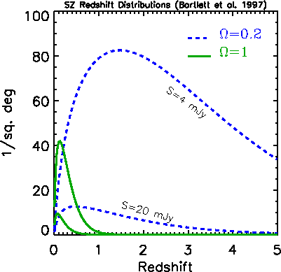show the redshift distribution for clusters of two given SZ flux densities and