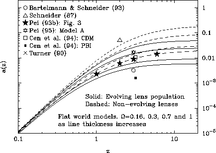 population of lensing galaxies evolves. All world models are flat, with