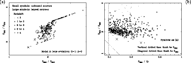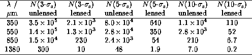 Estimates of the numbers of detectable galaxies expected in a Planck survey are listed in Table1. These were calculated by combining the counts discussed above with the estimates of the sensitivity of Planck (Bersanelli et al. (1996)) quoted in Table2. In order to produce conservative estimates, an Einstein--de Sitter world model and an evolving population of lenses are assumed in the calculations. The results can be scaled to match other scenarios using the counts in Figs2(a)&(b). Note that the predicted number of lenses could be increased by a factor of about 5 if both a non-evolving model of lensing galaxies and a non-zero cosmological constant were assumed.
