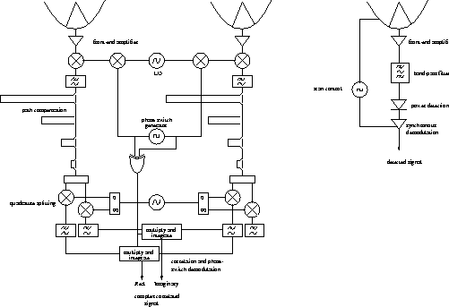 The price for this immunity to many systematics is greatly increased complexity (see Fig 1). An interferometer requires several antennas which can track the sky, each with its own receiver; a path compensation system to keep the paths to each correlator matched to much less than the coherence length; and the correlators themselves, which multiply and integrate the inputs, two per antenna pair (since the correlated signal is complex i.e. has two orthogonal components). It is usual to also phase-modulate the signal as soon as possible and synchronously demodulate it in the correlator, to eliminate any spurious signals in the RF and IF systems. The receiving system must also maintain phase stability over the signal path for at least the time interval between calibrations.