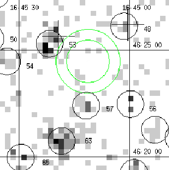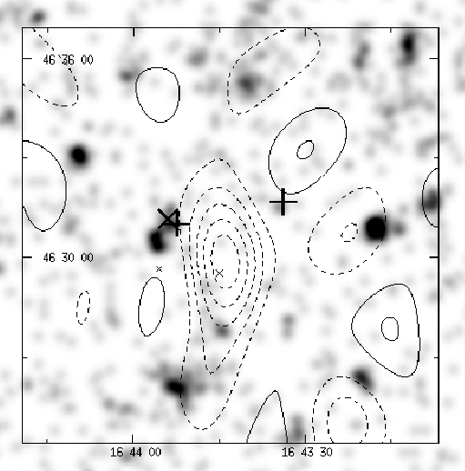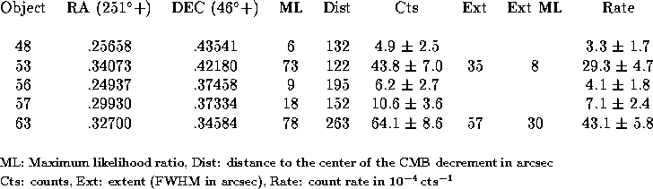 In Fig. 2 we show and detail in Tab. 1 the detected X-ray sources with a likelihood ratio greater than 5. This low likelihood ratio has been chosen to demonstrate that not even a marginally detected source can be found within the inner contours of the microwave decrement. Secure detections require at least a likelihood of 10.