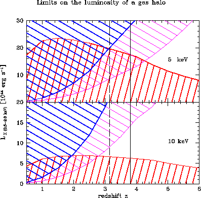 In Fig. 3 we show the SZ and x-ray limits on the x-ray luminosity of a gas halo in the energy range (observer) 0.5--2.0 keV.