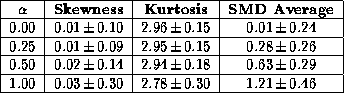 the mean and the standard deviation of the statistics skewness and SMD average