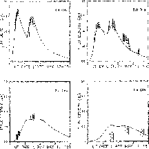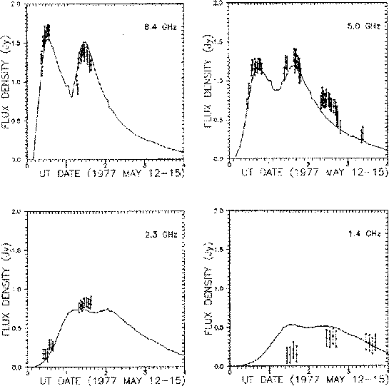 outbursts at the frequencies of 8.4, 5.0, 2.3 and 1.4 GHz. The continuous line