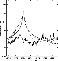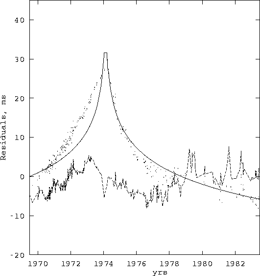 Figure 1: The TOA residuals for PSR B0525+21. The dots show the observed