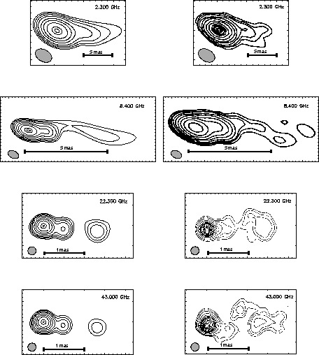 jet (right) of 1803+78 at different frequencies. The observing frequency and