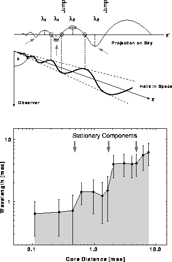 Further evidence for a helical jet structure is found from an analysis of the change in wavelength of the oscillations along the jet. We find that the wavelength increases stepwise as shown in the lower diagram of Figure 3. Such a behaviour is expected from a helical structure whose axis is at a considerable angle to the sky plane. The upper panel of Figure 3 illustrates this interpretation.