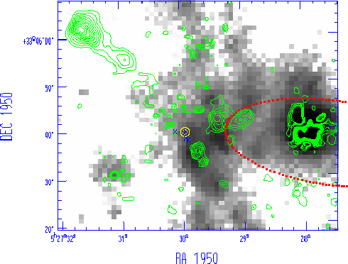 red wing, dashed line) on the K-band image greyscale, the position of the maser