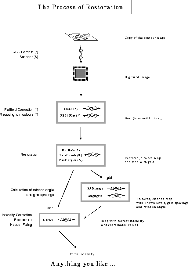 The idea behind the whole approach is to acquire digitized maps from data, which have been published in the form of contour plots, to compare the restored data with either new data, or also with restored data from other sources. Initially we wanted to compare newly measured X-ray data from the German Röntgensatellit (ROSAT) with older HI (atomic hydrogen) surveys, i.e. to make a detailed comparison of certain objects observed at different wavelengths (e.g. Herbstmeier et al. (1993),Mebold et. al (1993),Snowden et al. (1991)).