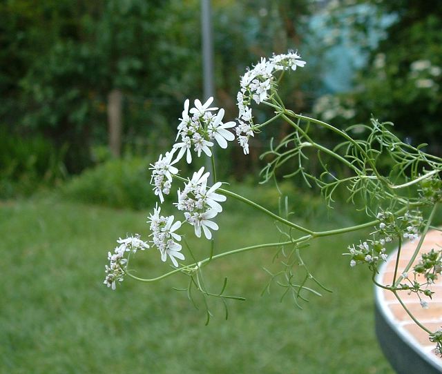 Coriander flowers. They are very cool! Only the outer flowers have big petals to look bigger and, I presume, to attract insect better. :)