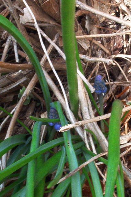 Little blue things popping up underneath the lavender.