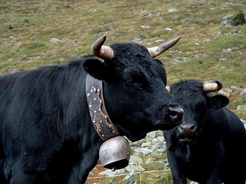 These beautiful cows are the local breed 'Vache d'Herens'. Both males and females have horns. In spring, the females fight in the 'combats de reines' - fight of the queens - to decide which cow will lead the hurd. This is a local tradition.