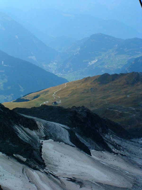 The view from the Mont Fort (3300m). The glacier of Tortin. Behind it, La Chaux. That's where one of the cable cars leaves from. Behind it, Sembrancher on the left (South) of which lies the valley of Entremont leading to the Saint Bernard pass into Italy.