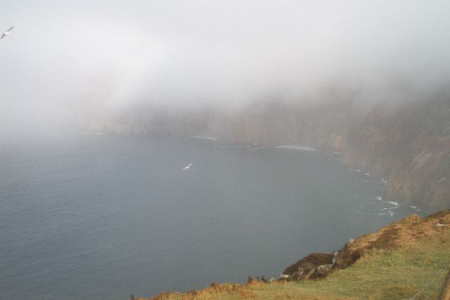 The cliffs! We were lucky there was a hole in the mist! Spot the seagull to get an idea of the grandeur of the cliffs...