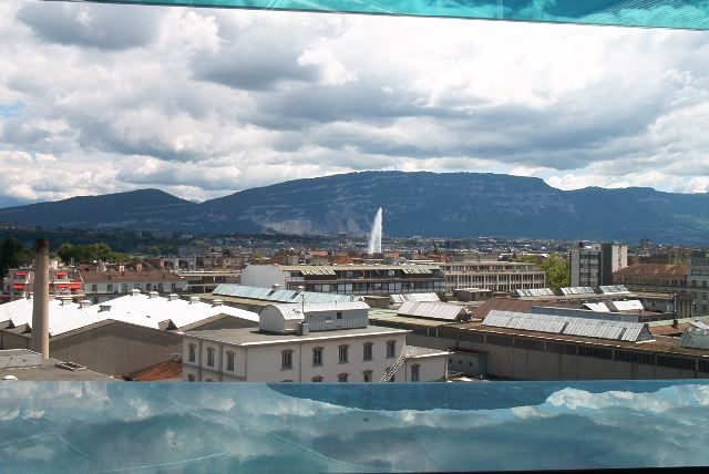 Through the UN(?) tower, the Geneva fountain