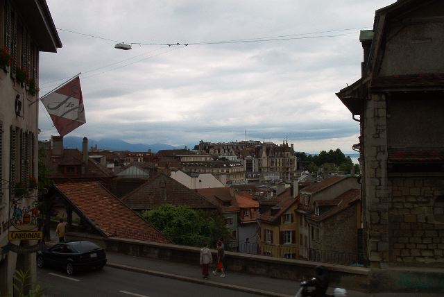 The view from the medievsl stairway leading to the cathedral. In the background, the alps and the lake.
