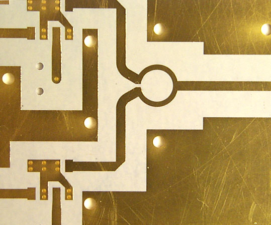 fig 1 The mixer layout before the mixer is mounted. Also shown the the power splitter that feeds the lo port on 2 mixers. The if port is connected to the trace coming extending to the side and into a via.