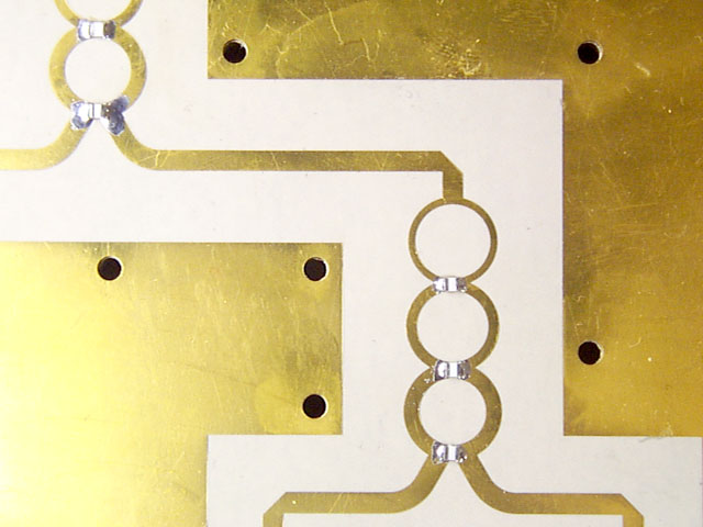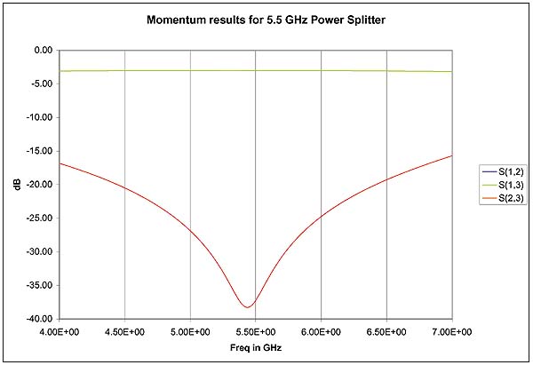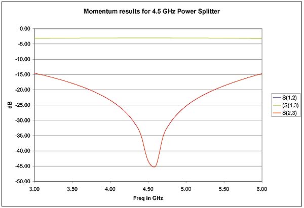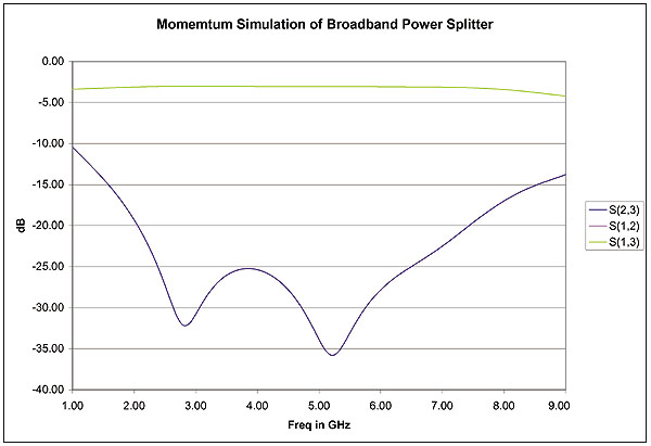 The simulation includes an attempt at simulating the thin-film resistor. It's the colored section at the right end. The resistor just consists of a conductor with a finite conductance. Of course, a real resistor is a bit more complicated than this. A real resistor can be made to approximate this design by "flip" mounting. For a thin film resistor, the resistor material is usually on the top side of a ceramic substrate. The resist material can be mounted closer to the circuit by mounting it upside-down. The throughput is S(1,2) and S(1,3), which lie on top of each other. All of the S parameters are symmetric, that is the indices can be swapped. Since the T-Junction is a broadband device, S(1,2) and S(1,3) are nearly flat at 3dB. The characteristic dip in S(2,3) comes from the departure of the 1/4-wave transformers away from the design frequency. The maximum of the dip was fine-tuned to be near the design frequency. The bandwidth of a power-splitter is nominally defined by S(2,3) ~ 20dB. For this splitter, the bandpass is about 3.5-5.5 GHz. Broad Band With many microwave devices, constructing a broadband version of a narrow-band version is just a matter of cascading sections. Such is the case for Wilkinson power splitters. The only rub is that each section must have 1/4-wave transformers of different characteristic impedance, and each resistor must be a different value. In practice, these values are arrived at by simulation. Li et al. have performed the arduous task and tabulated optimum parameters. They were able to build a very broadband splitter, from 2-18 GHz with 7 sections. Since we were not interested in such broad bandwidth, we could settle for the much smaller 3 section splitter. We used the values as listed in Li et al and verified them in simulation.