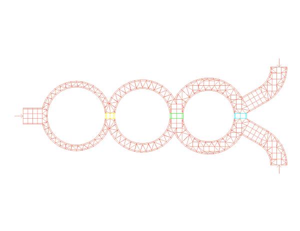 Each section of the power splitter is cut from a perfect ring, in keeping with the design in Li et al. Most of the filter was hand drawn, that is it was drawn using layout-only functions instead of transforming circuit elements. There is a gap of 25 mils cut in each section for the resistor to rest across. There were a few tweaks to the deign. The opening angle of the output transmission lines is not specified. We found out that smaller opening angle led to better S(1,2) and S(1,2), but to worse S(2,3). Obviously this was due to cross coupling between the outputs. Although the effect was not large, the angle used was a compromise.