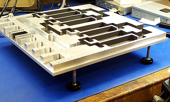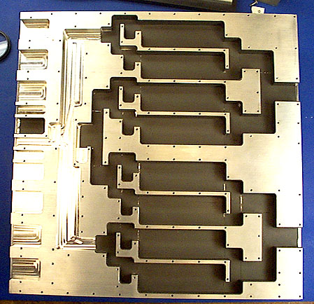 There is one problem with designing small channels and cavities in the lid: resonances. The resonant frequency can be modeled, but it is usually difficult to do this reliably. To suppress the cavity resonances, all the walls are painstakingly covered if ecosorb, a microwave absorbing material. The ecosorb comes in many different forms, the type we use comes in rubber mats with sticky tape on one side. |