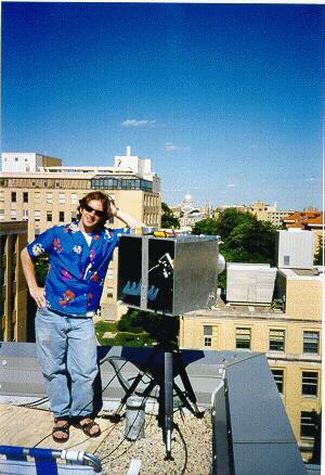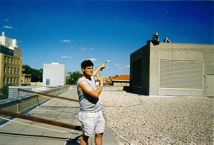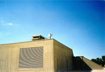 In the summer of 1997, We set up an antenna test range on the roof of Chamberlain Hall here in Madison. It was convenient because the building is L shaped and at each end of the L there was a 20 foot tall utility building. We set up a receiving station and a source station on the opposite utility buildings so that they were looking at each other. In this way, our source and receiver were elevated above any ground level interference effects and obstructions. We used the corrugated feed horns as the source and receiver and we rotated the receiver in a plane parallel to the ground.