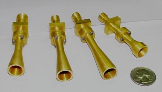 A photograph of a complete set of feed horns for the 16 element ACBAR bolometer array. The feed horns cover four separate mm & submm bands to provide excellent sensitivity to the Cosmic Microwave Background (CMB) radiation and the abililty to differentiate the weak CMB signals from emission from Earth's atmosphere and interstellar dust. ACBAR will be used on the South Pole 2.1 m Viper telescope.