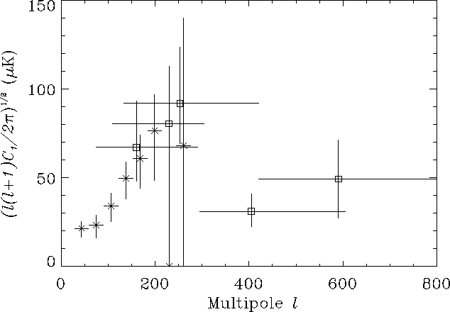 Measurements of the CMB power spectrum made using Python and Viper. The Python flat band power points (* symbols) are simultaneously estimated in 7 l bands including the cross-modulation theory and noise covariances (Coble et al. 1999, Coble 1999). The Python data provide an important link between the COBE data at large angular scales and data from instruments at intermediate scales such as CARA instruments Viper and DASI. The five Viper data points (open square symbols) represent the first results from Viper. The Viper data continue to accumulate. Taken together, the Python and Viper data show that the power spectrum has a peak near l = 200, the location expected for a geometrically flat universe. Einstein showed that for a critical matter density of the universe, the geometry of the universe would be flat. Direct measurements of the matter density, however, indicate that it is only equal to one third of the critical value. The Python and Viper data thus strongly indicate that another form of energy must exist and dominates the present energy density of the universe.