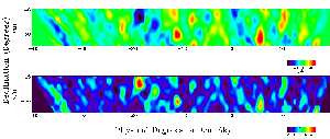 Image of anisotropy in the Cosmic Microwave Background (CMB) measured by the CARA's Python telescope at the South Pole. The top image shows structure in the CMB coded with red for hot spots and blue for cold spots. The lower panel shows the signal to noise ratio for the features in the top plot indicating that the structure is indeed real and not an artifact of noise. The CMB provides a snapshot of the universe when it was only 300,000 years old, revealing the structure which eventually evolves into the rich structure seen in the present universe which is roughly 50,000 times older (Coble et al. 1999, Coble 1999).