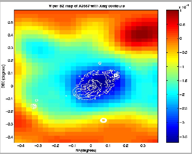 Viper Sunyaev-Zeldovic effect image of A3667. The gravitational pull of dark matter within a cluster of galaxies traps a hot gas of electrons. These electrons scatter off protons creating x-ray emission, shown here as contours. The x-ray emission is brightest at the center. The electrons also scatter cosmic microwave background (CMB) photons, producing a dimming shown here as a blue color. This CMB dimming is known as the Sunyaev-Zel'dovich effect (SZE). By carefully mapping both the x-ray emission and the SZE we can determine the distance to the cluster which allows us to determine the expansion speed of the universe. The cluster, known as A3667, is the first to be mapped in SZE using the Viper telescope. Hundreds of galaxies are also trapped in the cluster gravitational potential, but they are not visible at these wavelengths.