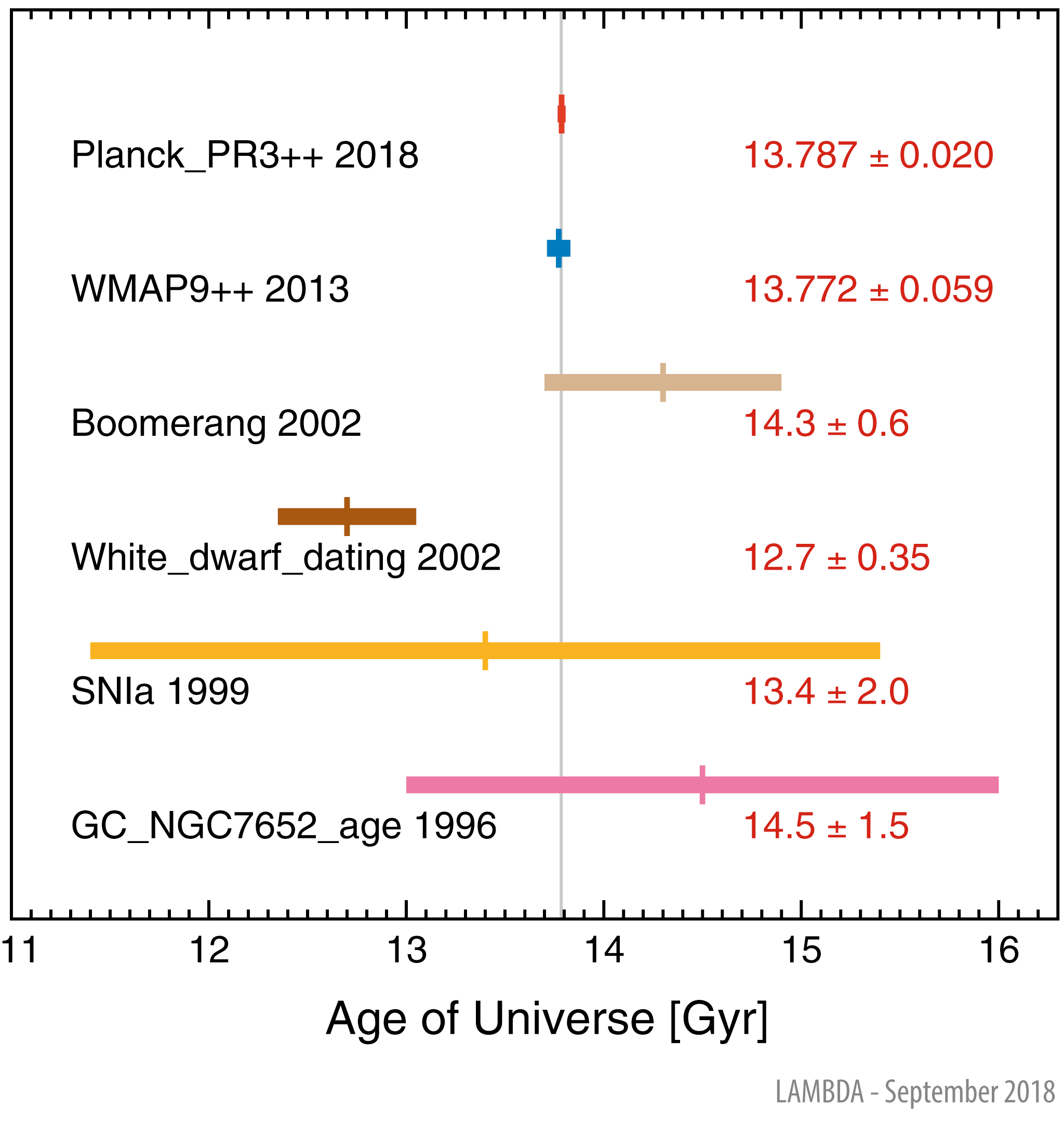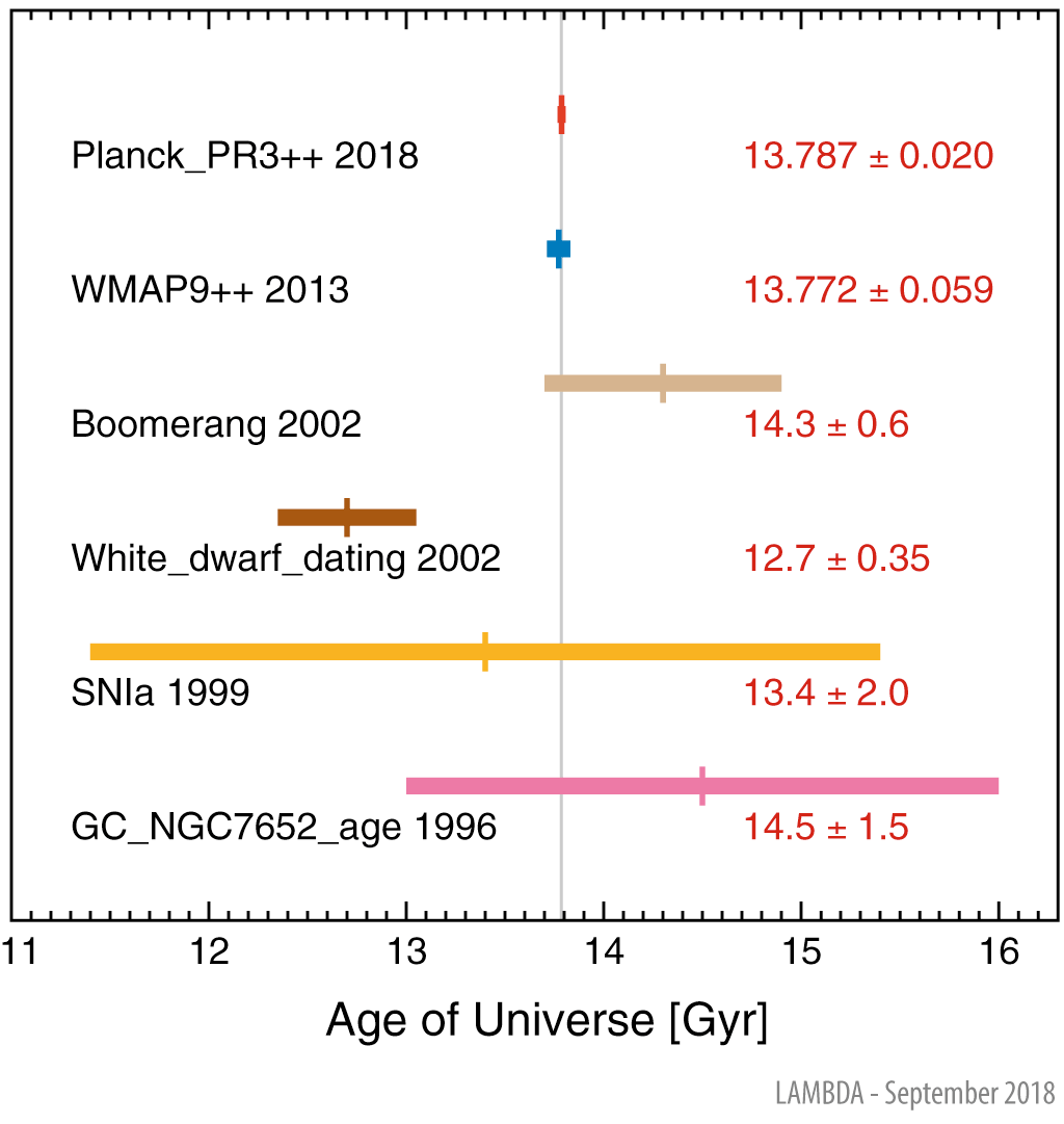 Lower limits on the age of our universe, t0, may be obtained by estimating the ages of the oldest observable objects. Ages determined in this fashion tend to rely on stellar evolution theory, rather than an assumption of a cosmological model such as ΛCDM. Two representative values are shown, based on cool white dwarfs and the oldest stars in globular clusters, but note that results obtained in this fashion have produced a range of estimates between roughly 12-16 Gyr (Spergel et al. 2003). Within Big Bang cosmologies, t0 refers to the time interval since the Big Bang up through the present. The computed value is somewhat dependent of the exact cosmological model assumptions. Within the standard ΛCDM model framework, CMB measurements, combined with BAO and SNIa measurements of the expansion rate, are presently in agreement and tightly constrained. The gray vertical line, representing the weighted average of WMAP and Planck data points, is positioned at t0 = 13.785 Gyr.