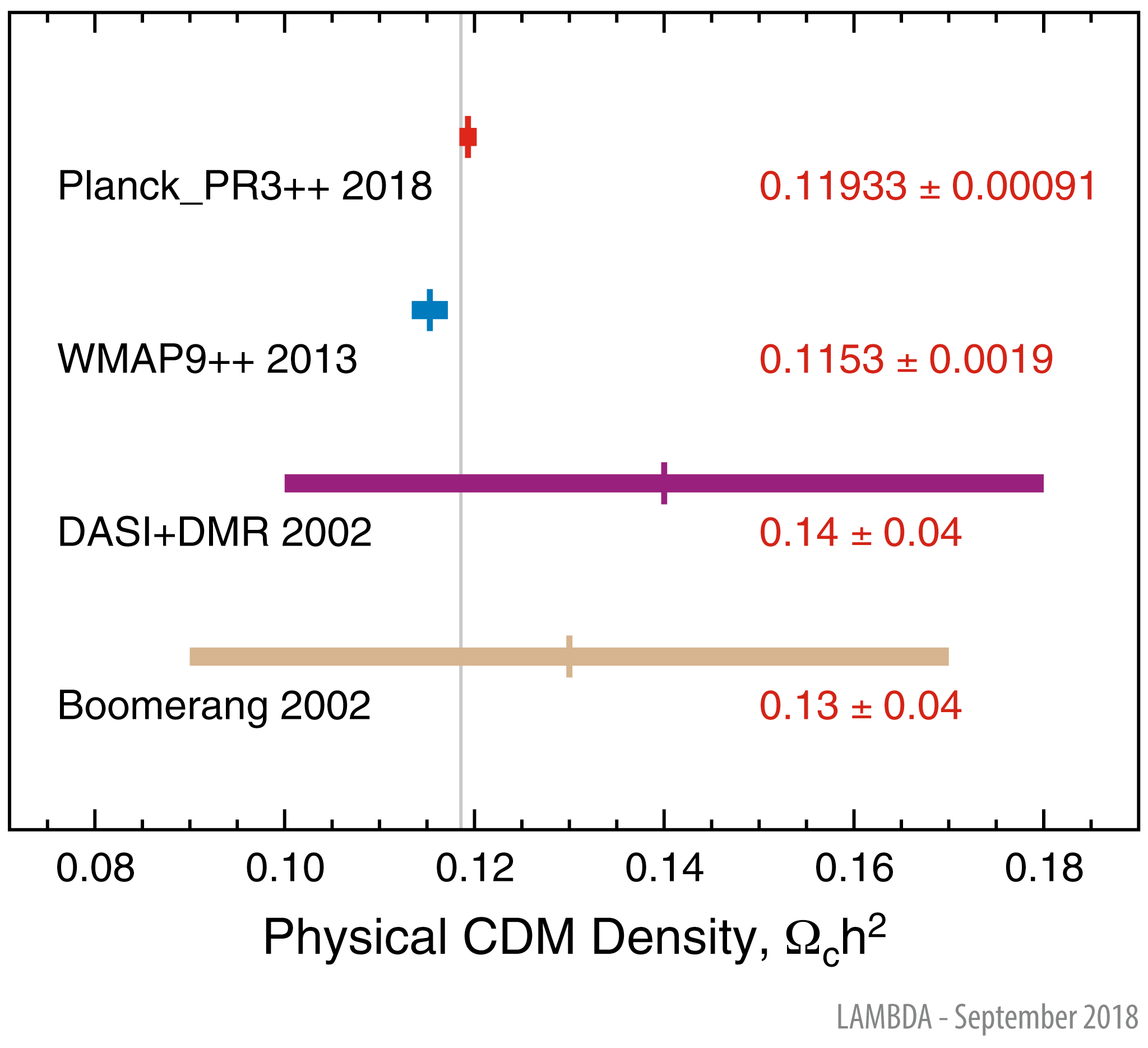 In ΛCDM, most of the Large Scale Structure in the universe is associated with cold dark matter. Dark matter is not easily detected, but its presence is inferred from gravitational effects such as lensing and galactic rotation curves. All four entries in the above plot are determined from analysis of CMB data: the current most precisely determined values are represented by the Planck 2018 and WMAP 2013 points, which also include data from other experiments. The values indicate very roughly 25% of the present-day universe is comprised of CDM; the percentage contribution from ordinary matter is much lower (see the Ωbh2 figure). Slight tension exists between WMAP and Planck CMB determinations for cold dark matter content. Unfortunately, alternate methods of corroboration at this precision level are not currently available. The gray vertical line, representing the weighted average of WMAP and Planck data points, is positioned at Ωch2 = 0.1186.