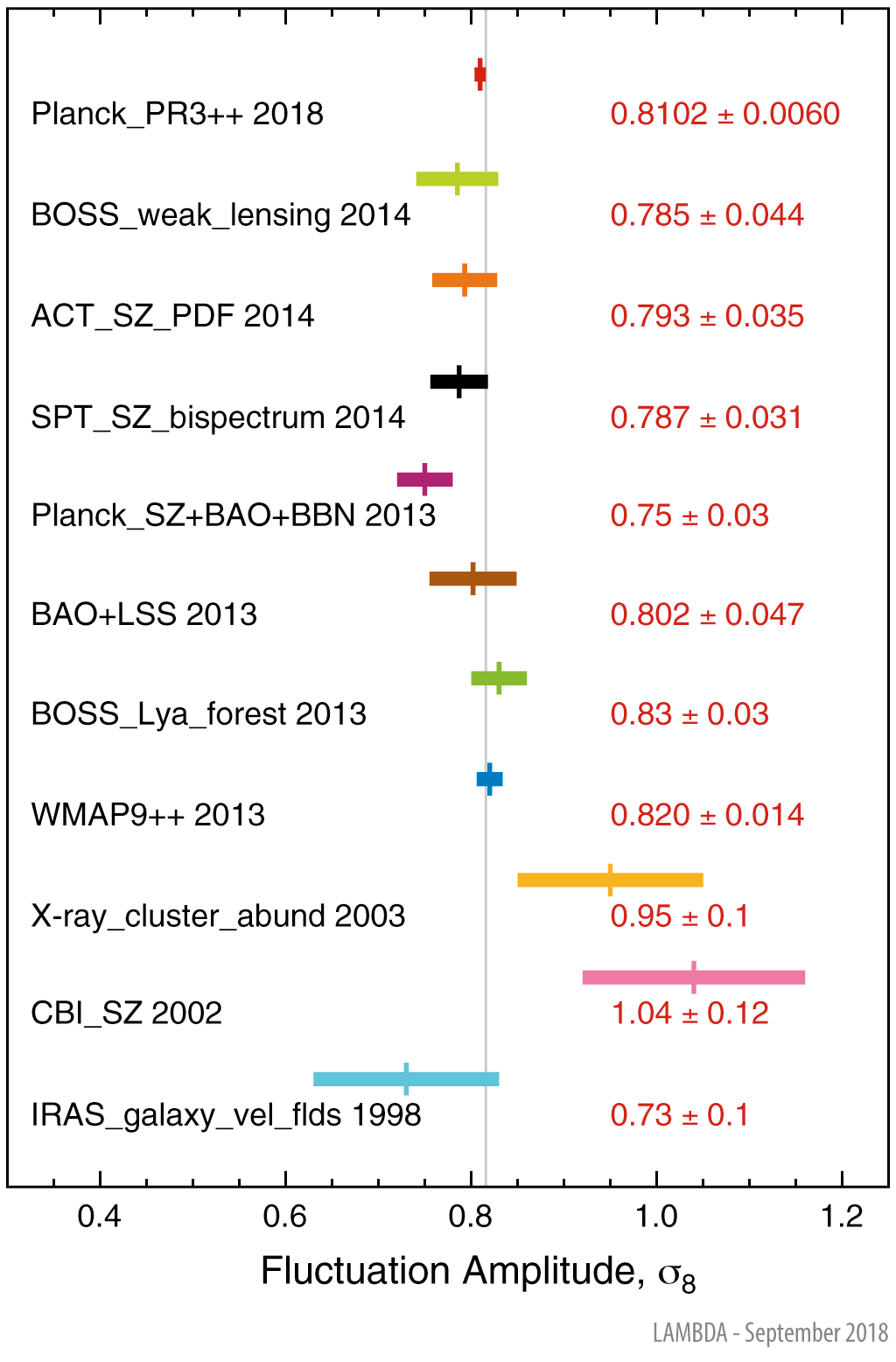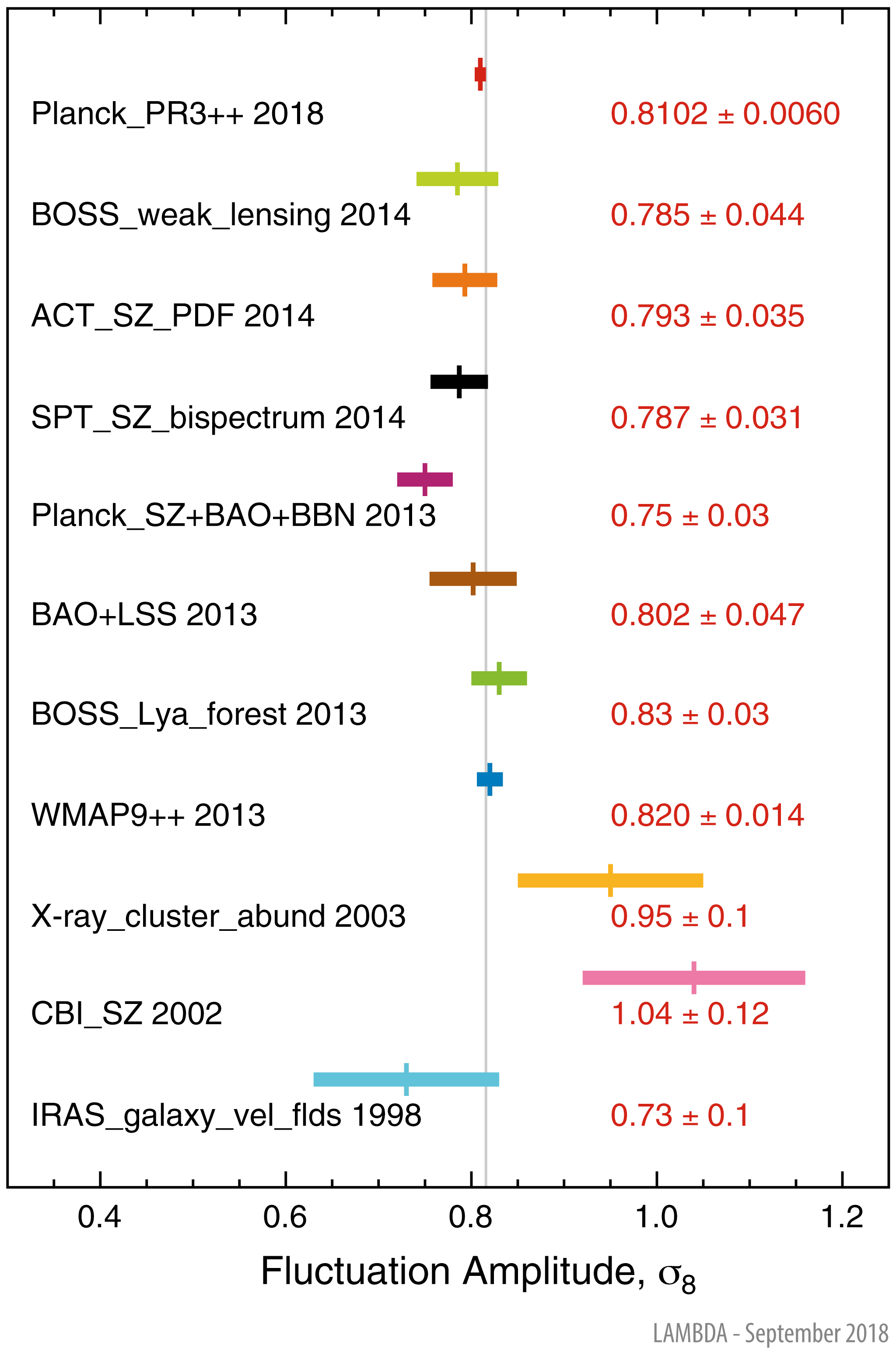 The amplitude of the primordial matter power spectrum is parameterized by σ8. This provides an important constraint on clustering of matter (CDM dominated) and the formation of structure. As with Ωm, methods using observations of galaxy clusters (abundances, velocity fields, WL) can suffer from degeneracies with other parameters. Alternate methods make use of the SZ effect. Recent determinations of σ8 using these lower-redshift data show a slight preference for lower values than those from CMB determinations. It is too early to definitively invoke interesting cosmological physics as the cause, since underlying systematics may still be present. The gray vertical line, representing the weighted average of WMAP and Planck data points, is positioned at σ8 = 0.8163.