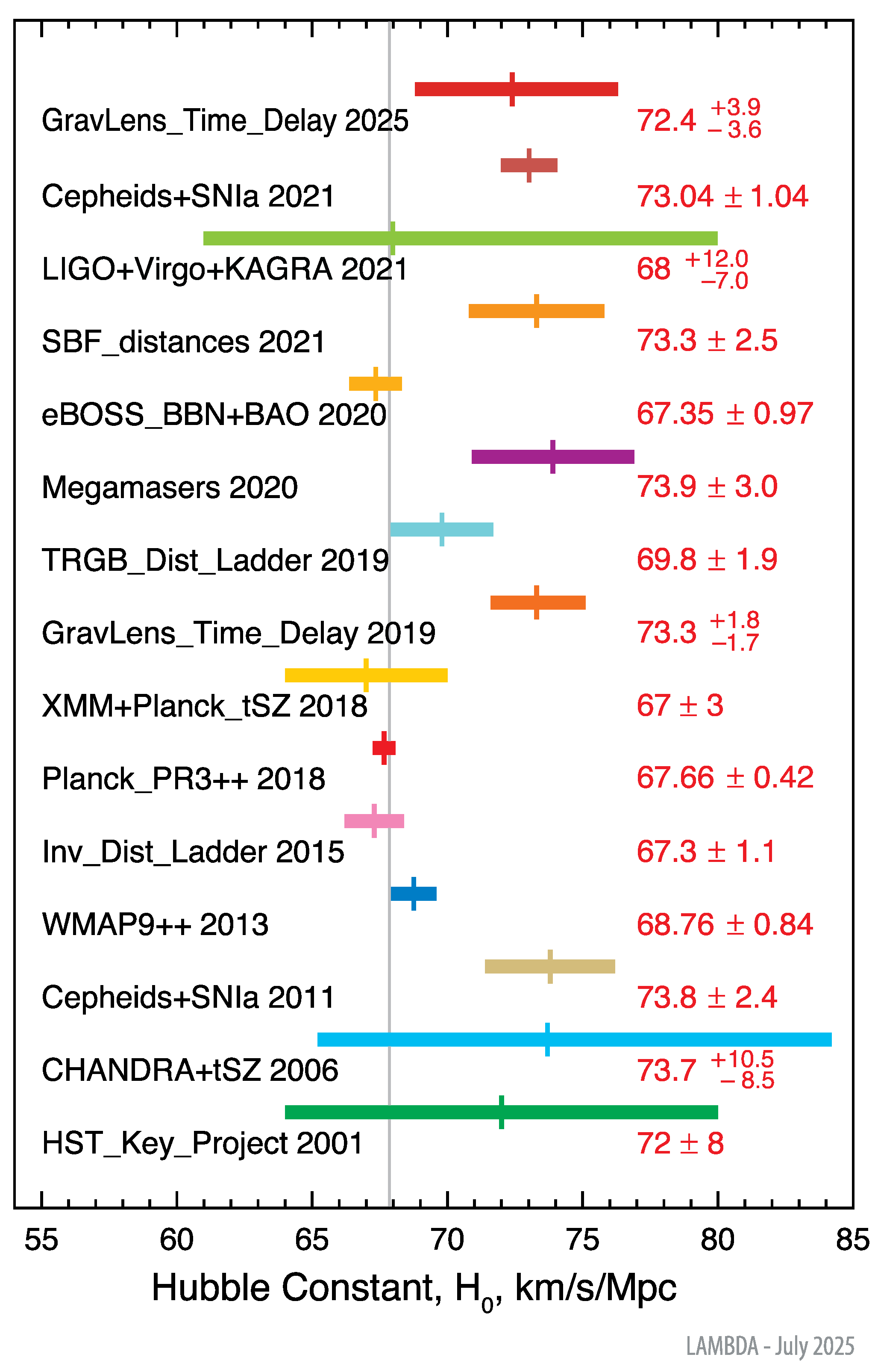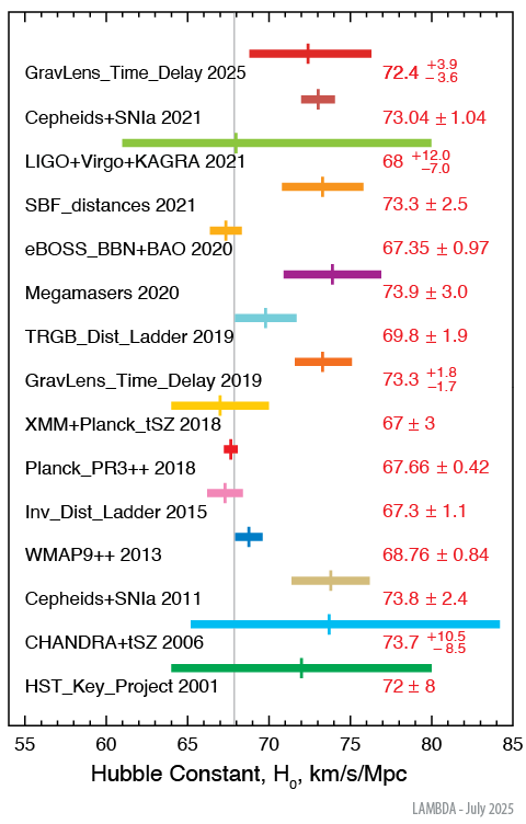 Hubble ConstantThe time-dependent expansion of spacetime is characterized in the FLRW equations as a function of redshift z by the Hubble parameter H(z). Under the assumption of ΛCDM, H(z) = H0 * sqrt(Ωm(1+z)3 + ΩΛ + Ωk(1+z)2) (e.g. Wei & Wu 2017, Chen, Kumar & Ratra 2017, Verde et al. 2014, Farooq & Ratra 2013). The present-day (z=0) value of the expansion is referred to as the Hubble constant, H0. There is a long history in the literature toward determination of an unbiased and accurate value of H0, dating from the 1920's with the observations of galaxies by Hubble. There are a number of reviews of this history; we cite for example Freedman & Madore (2010), and online websites such as this one at CFA. Current values in the literature hover near 70 km/s/Mpc. However, a concordance value with associated uncertainty 1% or less has yet to be reached, and recent literature has noted the moderate tension between values for H0 derived using a variety of methods. Both unaccounted-for uncertainties in the data and potential inadequacy of the standard ΛCDM model may explain the tensions. We illustrate the recent history of Hubble constant determinations with two separate plots. The first plot intercompares H0 values derived from a variety of methods. This plot is designed to provide an overview of methods and tensions discussed in the literature. Some measurements presented in this plot combine multiple datasets. The second plot compares determinations of H0 through the use of only CMB data. The first determinations of H0 involved measurements of distances and radial velocities associated with objects far enough away to not be bound gravitationally to our Local Group. Distances determined on cosmological scales rely on the 'distance ladder', which builds on the reliability of direct measurements close-by and the extension of those measurements outward through the use of standard candles such as Cepheid variables and Type Ia supernovae. We represent determinations of this type with four entries in the first plot: the HST Key Project (Freedman et al. 2001), Cepheids+SNIa (Riess et al. 2011), TRGB Dist Ladder (Freedman et al. 2019) and Cepheids+SNIa (Riess et al. 2021). For the 2021 Riess et al. entry, we plot the SH0ES result using Cepheids+SNIa only; when combined with independent TRGB measures they derive a value of 72.53 ± 0.99. Characterization of potential systematics affecting the distance determination is a key issue in this method. Another standard candle method, based on the correlation between turbulent emission lines velocity dispersion and their integrated luminosity, is employed by Fernández Arenas et al. (2018) to derive H0 from observations of H II galaxies and giant H II regions. They report an initial result of 71.0 ± 2.8(random) ± 2.1(systematic) km/s/Mpc. Recent advances in gravitational wave (GW) detection technology provide an analysis approach independent of the cosmic distance ladder. The first estimate of the Hubble constant using a GW source detection was a joint effort of the LIGO/Virgo teams (Abbott et al. 2017), combined with collaborative followup observations identifying the optical counterpart of the source. In this determination, the amplitude of gravitational waves resulting from the merger of a binary neutron star system are analyzed to determine the luminosity distance to the system, and a cosmological redshift obtained from optical identification of the source host galaxy. The most recent determination from the LIGO-Virgo-KAGRA Collaboration (2021) uses 47 gravitational wave sources from the Third LIGO-Virgo-KAGRA Gravitational Wave Transient Catalog, deriving a value of 68-7+12 km/s/Mpc. Future GW source detections should provide tighter constraints. In ΛCDM theory, a characteristic acoustic scale for the oscillating primordial photon and baryon plasma is established at the time of decoupling, when the plasma temperature has cooled sufficiently for recombination. Acoustic features are detected not only in CMB radiation power spectra, but also in the linear matter power spectra constructed from positional information of objects in large-scale structure surveys (Baryon Acoustic Oscillations, BAO, e.g., Eisenstein, Hu & Tegmark 1998). BAO data alone cannot be used to derive H0, but combinations of BAO with CMB, large-scale structure (LSS) clustering information or baryon density may be used for this purpose (e.g., Addison et al. 2013). A combination of this type, labeled 'BAO+D/H 2017' in the plot, is represented by the results of Addison et al. (2017), who used BAO constrained with a baryon density determined from deuterium abundance combined with BBN theory. Aubourg et al. (2015) used BAO + SNIa in combination with CMB sound horizon scale (an 'inverse distance ladder' technique) to infer H0 = 67.3 ±1.1 km/s/Mpc without the constraint of a flat ΛCDM cosmology. Strong gravitational lensing of a variable source, resulting in multiple lensed images, may be used to obtain H0 via the observed time delay for an intrinsic source brightness change to propagate between lensed images. The time delay function is proportional to H0-1, but also requires knowledge of the lens redshift and angular diameter distances involved, and has some dependence on the assumed cosmology. The technique presents challenges in observational precision and accuracy in modeling the lens mass distribution; for reviews, equations and error discussion see e.g. Schechter (2005), Freedman & Madore (2010), Suyu et al. (2010), Linder (2011) and Wilson et al. (2017). Although the basic theory was discussed as early as 1964 (Refsdal 1964), improvements in observational sensitivity and lens modeling have been a key to shrinking uncertainties. Two results are shown based on several strongly lensed systems and the assumption of ΛCDM: that from the COSMOGRAIL project (H0LiCOW; Bonvin et al. 2017, Wong et al. 2020) and the subsequent TDCOSMO Collaboration (2025). Observations of the thermal SZ ef