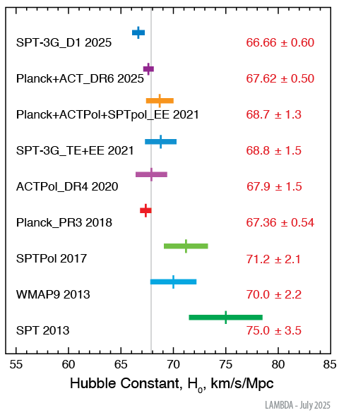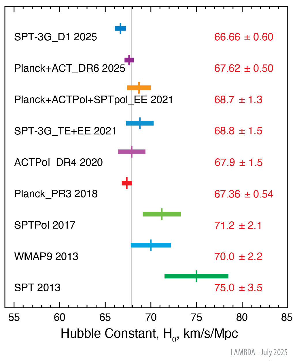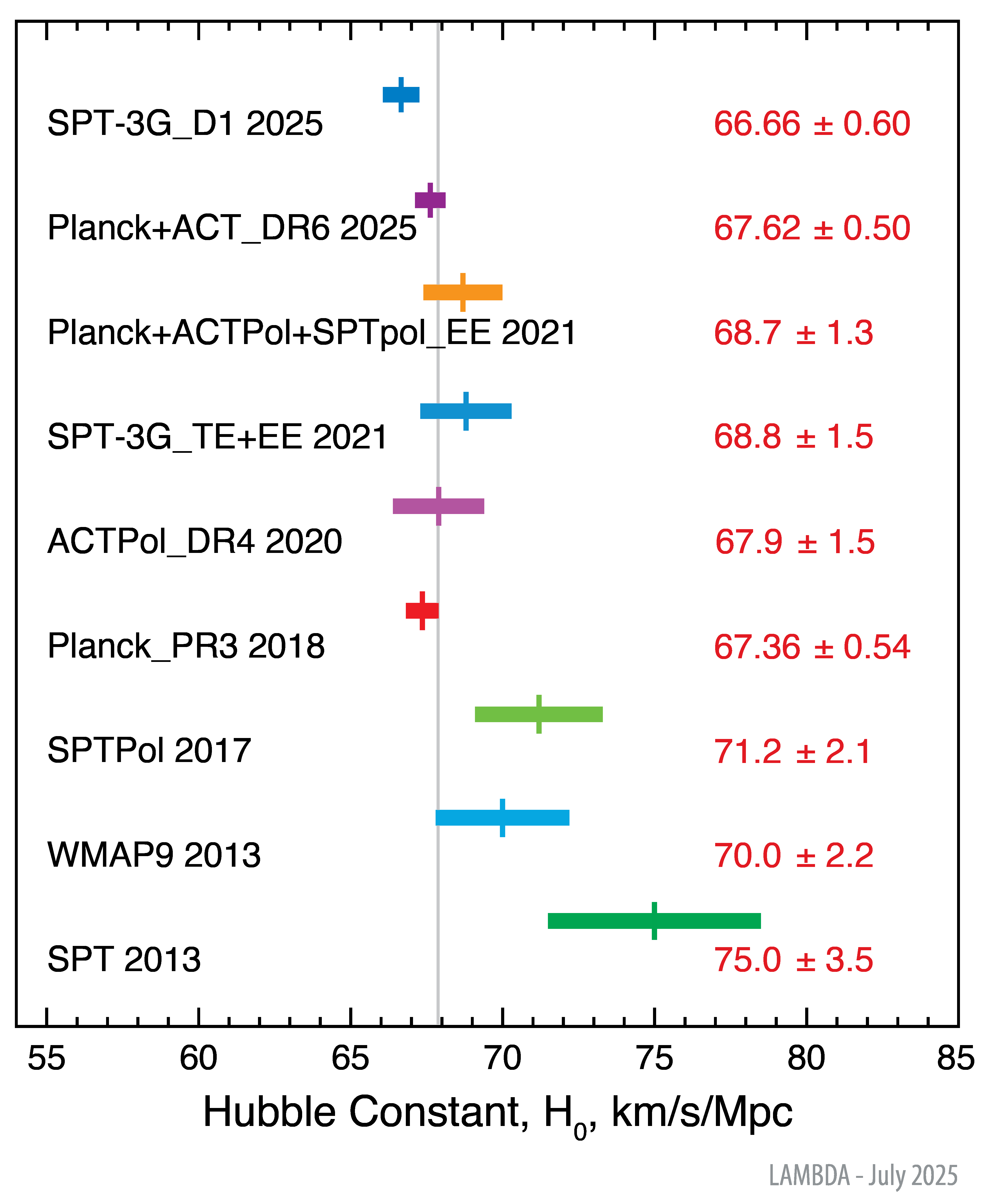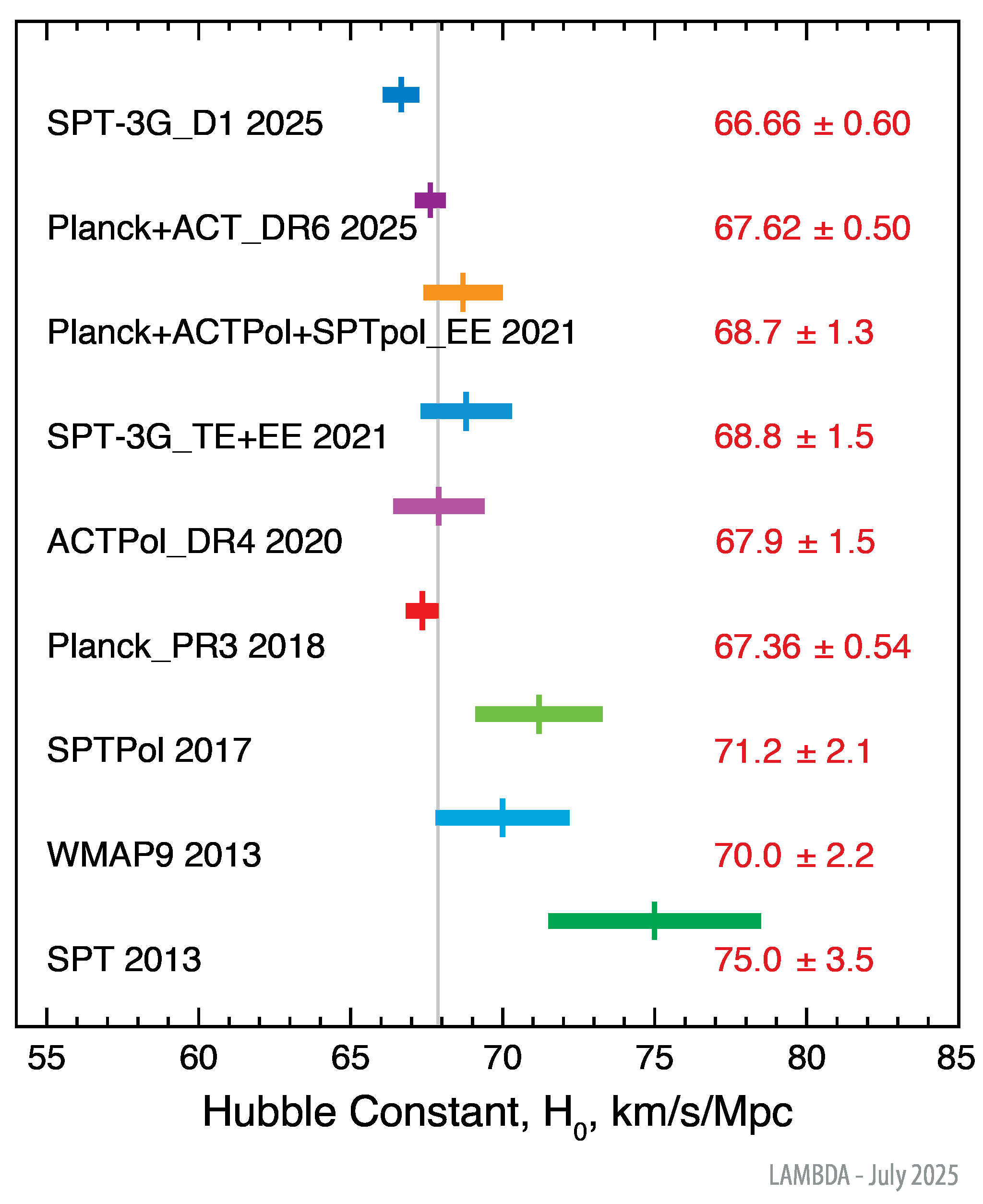 ![]() Image Credit: NASA / LAMBDA Archive Team The value of H0 may be inferred from fits of the ΛCDM model to observations of the Cosmic Microwave Background (CMB). Because the CMB data represent a snapshot of the universe at high redshift, this method relies on the model to compute the Hubble parameter at z=0 and is not a direct measurement of H0. How well low redshift direct measurements agree with model predictions based on fits to high redshift data serves as a test of the standard ΛCDM model. This figure illustrates recent H0 determinations using only CMB data, uncombined with lower redshift measurements. Quoted uncertainties for the 2025 Planck+ACT_DR6 results are the smallest of those shown.