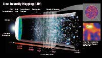 LIM measures the integrated sky emission from a specific atomic or molecular line transition at different redshifts, in effect taking 'snapshots' in time that show the evolution of these tracers of luminous gas and dust in the universe. As the Era of Reionization begins, the first stars to form heat their nearby surroundings, forming bubbles of ionized gas embedded within a largely neutral medium. As dark matter halos continue to condense, the star formation rate increases and the regions of neutral gas shrink until reionization is complete. Structure continues to grow and merge under the influence of gravity, forming a vast cosmic web of dark matter density. The abundance of luminous galaxies traces the statistics of the underlying matter density. The cosmic star formation rate continues to increase until peaking near redshift z ~ 2, and then starts to decline to present day levels. A slice through the cosmic volume shown here near z~1 simulates a false color image of the line emission captured by the lower resolution LIM observations at a fixed redshift, and superposes the positions of the galaxies (small dots) associated with that emission. The appearance of the LIM image will evolve as one looks back in time (increasing z), and analysis of those changes will provide a more detailed reconstruction of ionization history, star formation rates, and growth of structure, beyond the very general picture discussed here. Use of multiple line tracers enhances the picture of physical conditions and allows for consistency checks.