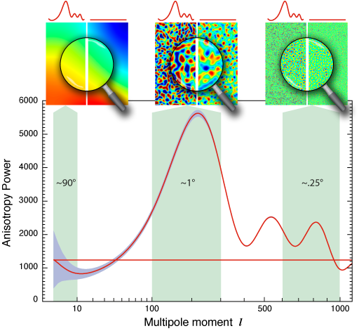 Image Credit: NASA / WMAP Science Team / Theophilus B Griswold PNG (512 x 471 px) (135 KB) / PNG (1024 x 942 px) (435 KB) / PNG (2048 × 1884 px) (1.3 MB) / PDF (1.3 MB) / SVG (1.6 MB) This graph shows the sky's temperature (colored patches) when measured at different angular scales across the sky. Angular scale decreases with increasing multipole moment.The wiggly line is the actual sky measurement. The straight line is the same measurement of sky energy if there were a true uniform distribution of temperature. The sky images shown above each of three separate green-shaded portions of the graph show the appearance of the temperature fluctuations under these two scenarios.